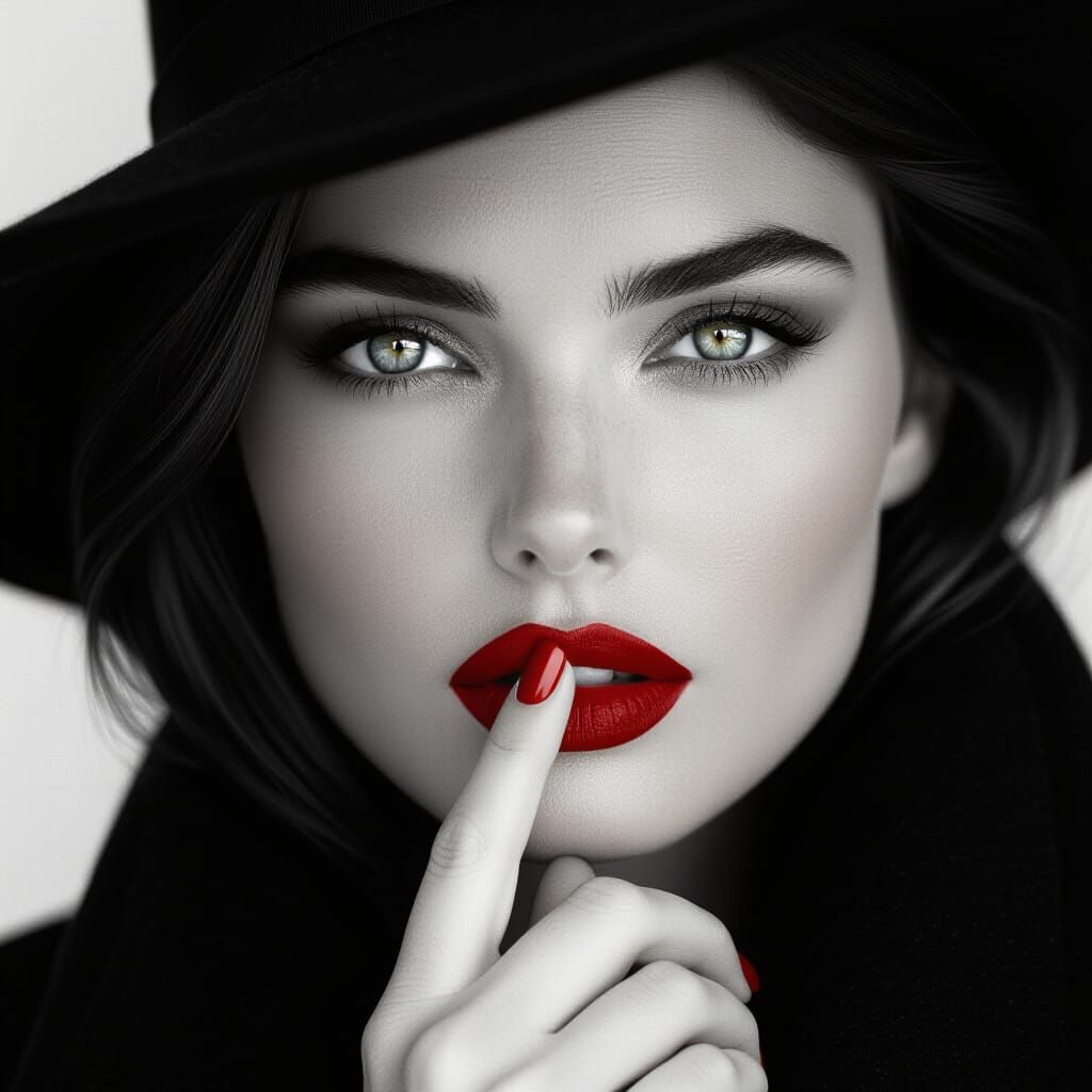 A dramatic black and white image of a woman in shadow. Light catches her eyes and red lips, creating a moody and emotional atmosphere in a high-contrast style.