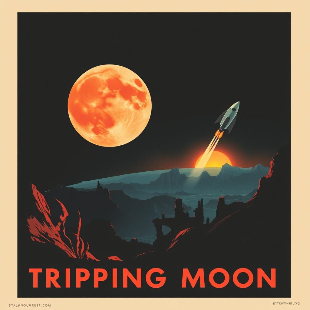 This image depicts a vintage-style travel poster featuring a sleek rocket ship soaring through space, with a distant alien moon in the background. The moon is dotted with crystalline formations and bathed in a binary sunset, evoking a sense of optimistic futurism and retro-futuristic wonder.