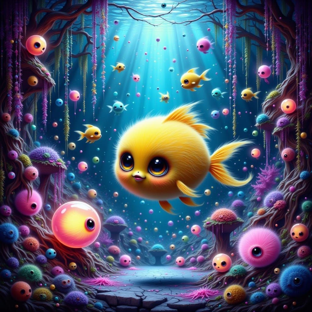 A vibrant scene features furry yellow fish swimming in an enormous aquarium. The fantastic digital art style incorporates glowing alien creatures in a neon-lit, whimsical aesthetic.