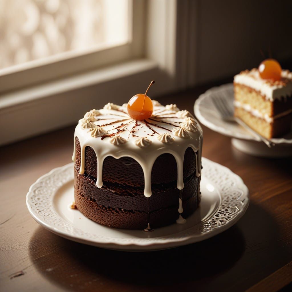This image captures a single mini cake on a simple plate, bathed in warm, cinematic light with deep shadows and a subtle hint of beige. Shot in a classic still life style with a shallow depth of field, evoking a timeless, gourmet feel.