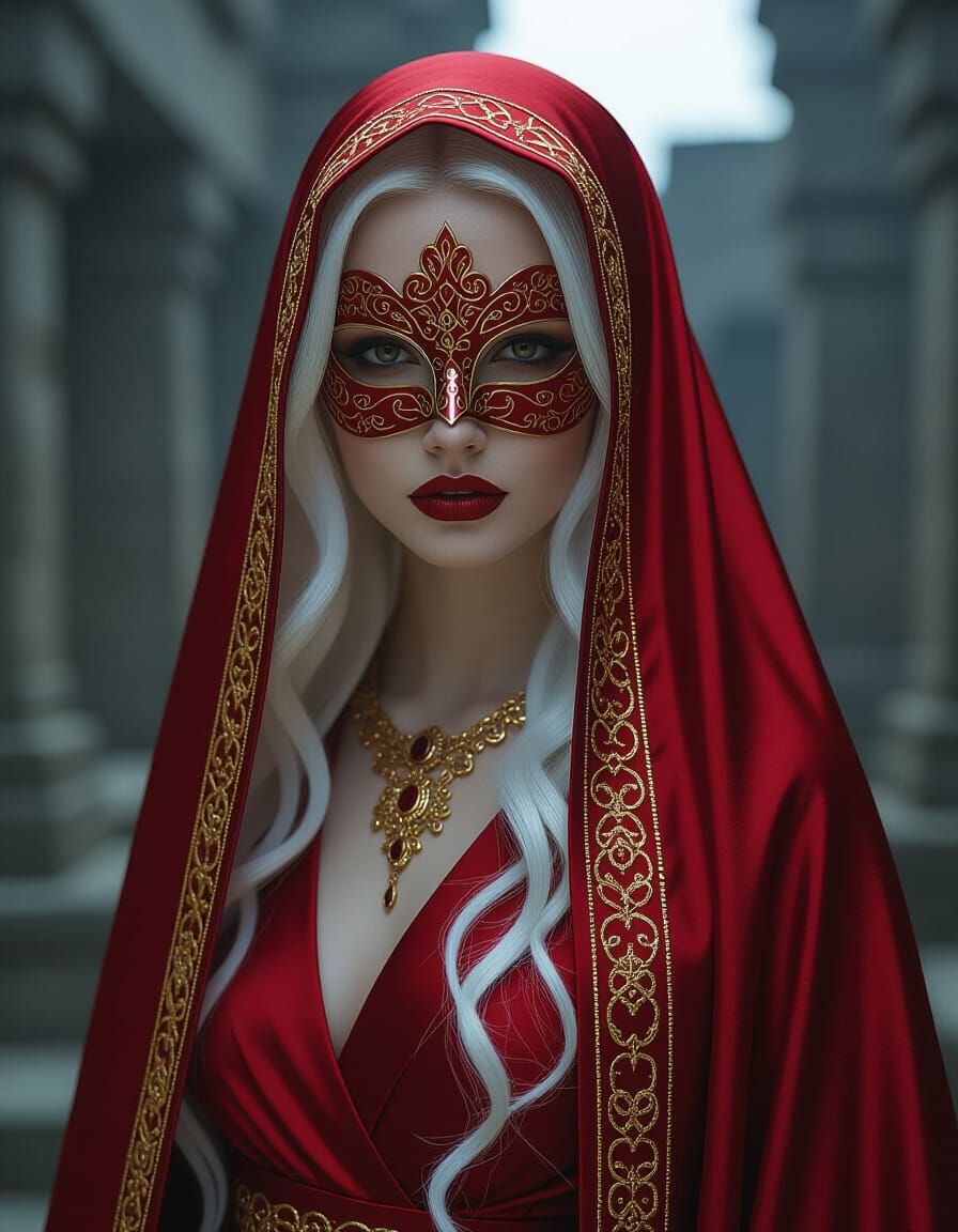 A striking picture of a woman in red robes and a decorative mask. The image features dramatic lighting and textures, with a cinematic feel reminiscent of digital matte painting.