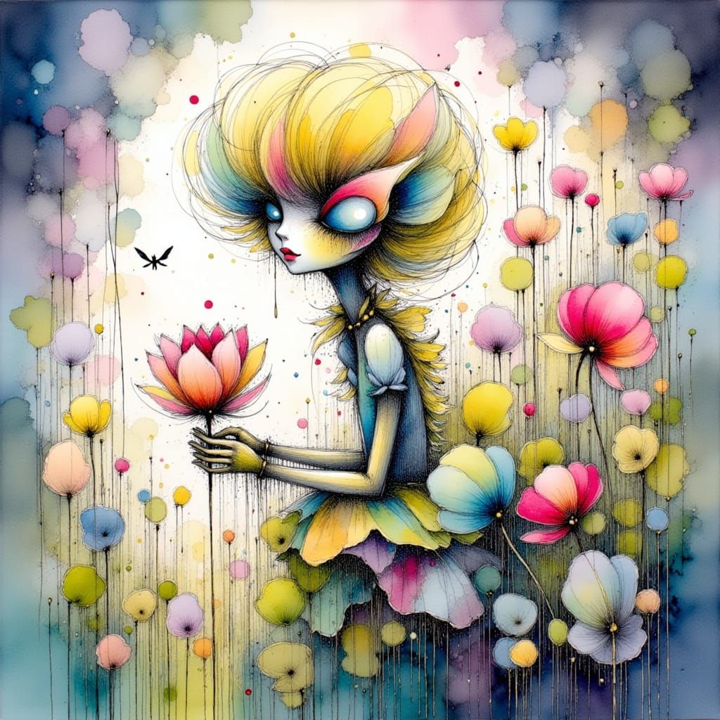 This image depicts a magical forest fae using alcohol ink and watercolor techniques. It captures an ethereal and enchanting woodland scene.