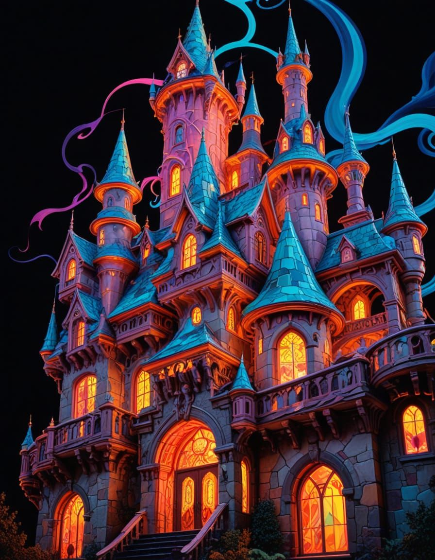 A low-angle shot of a gothic castle, showcasing pop surrealist art with vibrant neon colors and swirling abstract patterns. The high-contrast lighting emphasizes the intricate details.