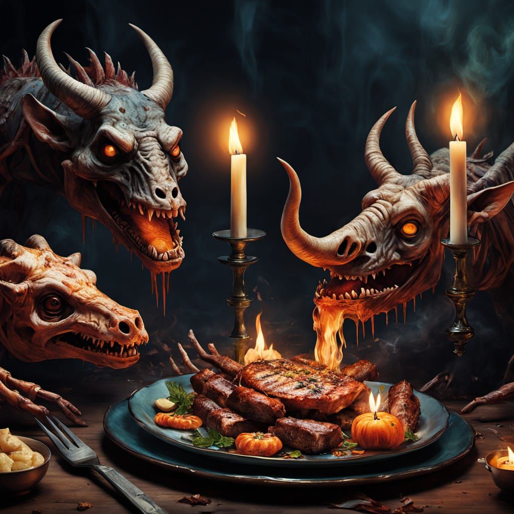 This digital art piece presents a close-up, unsettling scene of grilled animals alive on a platter, with contorted faces and distorted anatomy. Rendered in vibrant, dark colors with flickering candlelight, it evokes a disturbing dark fantasy aesthetic.