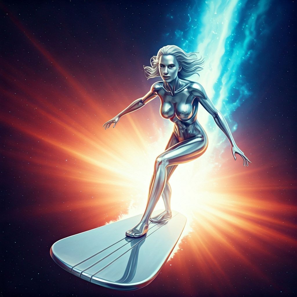 A digital 3D render of a woman as a silver-skinned superheroine surfing through space. The vibrant galaxy is depicted with bright neon stars and colorful cosmic clouds, in a computer-generated style.