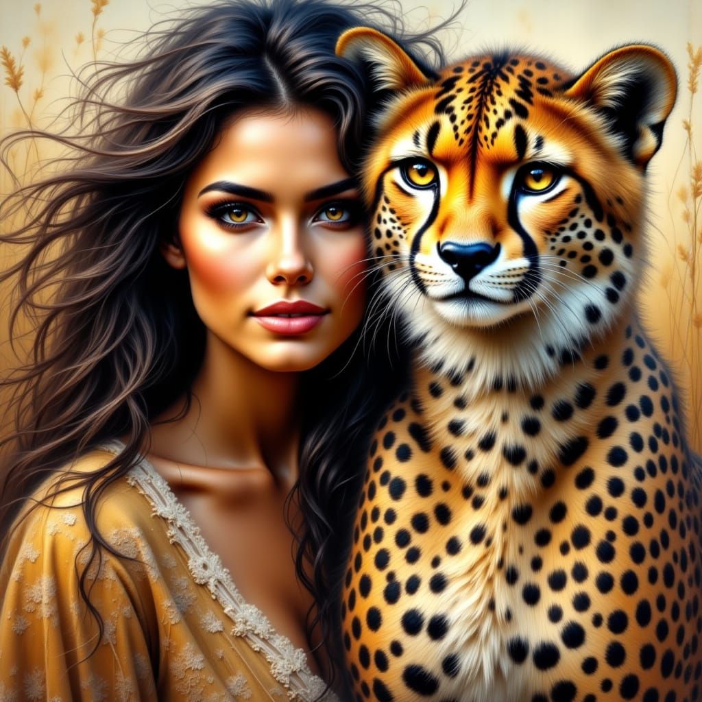 Generate stunning portraits of women with majestic cheetahs. Free, easy, and flexible AI image creation.
