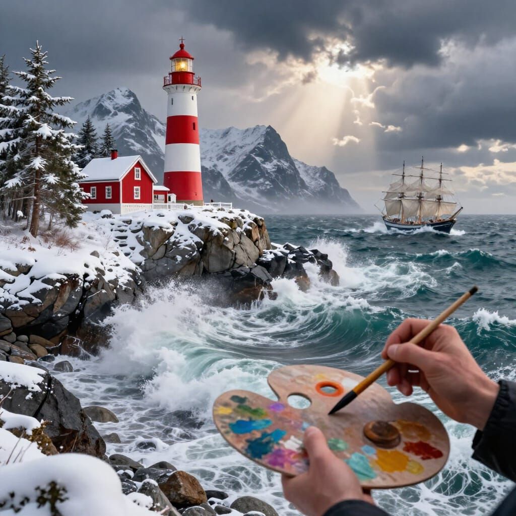This image shows a dramatic, hyper-realistic scene of a stormy ocean with massive waves hitting a snowy shore. A red lighthouse, house, and sailing ship are featured, with cinematic lighting and vivid colors.