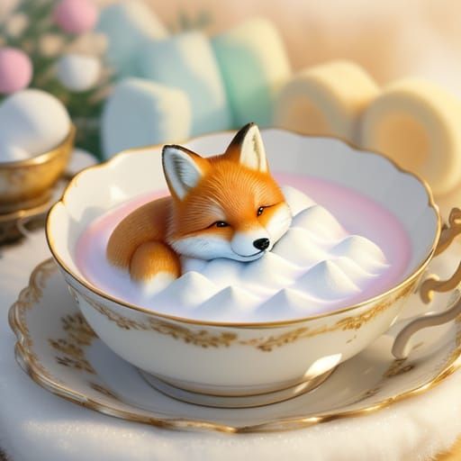 A charming digital artwork of a sleeping red fox nestled in a marshmallow-filled teacup. The soft focus, pastel color palette, and warm lighting create a cozy, calming atmosphere.