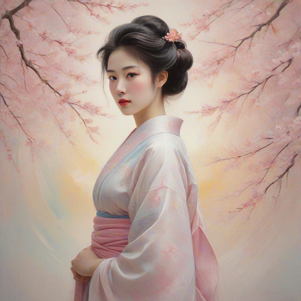 This image shows a serene geisha in a soft, painterly style, with delicate cherry blossoms on her kimono, set against an ethereal, swirling vortex of pastel colors. Evokes a dreamlike atmosphere.