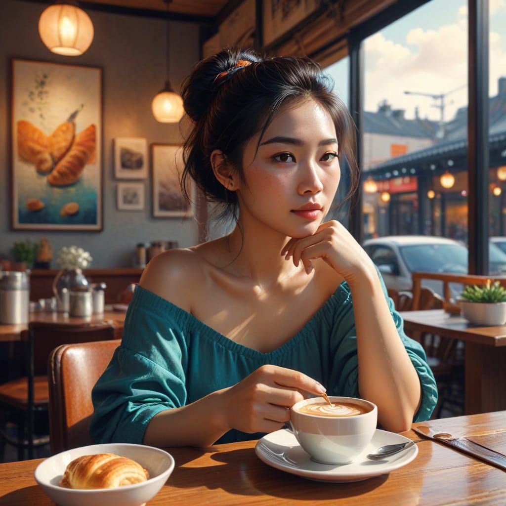 This digital art illustration shows a young Asian woman in a cafe, enjoying coffee and a croissant. Features vibrant colors and soft painterly textures with warm lighting.