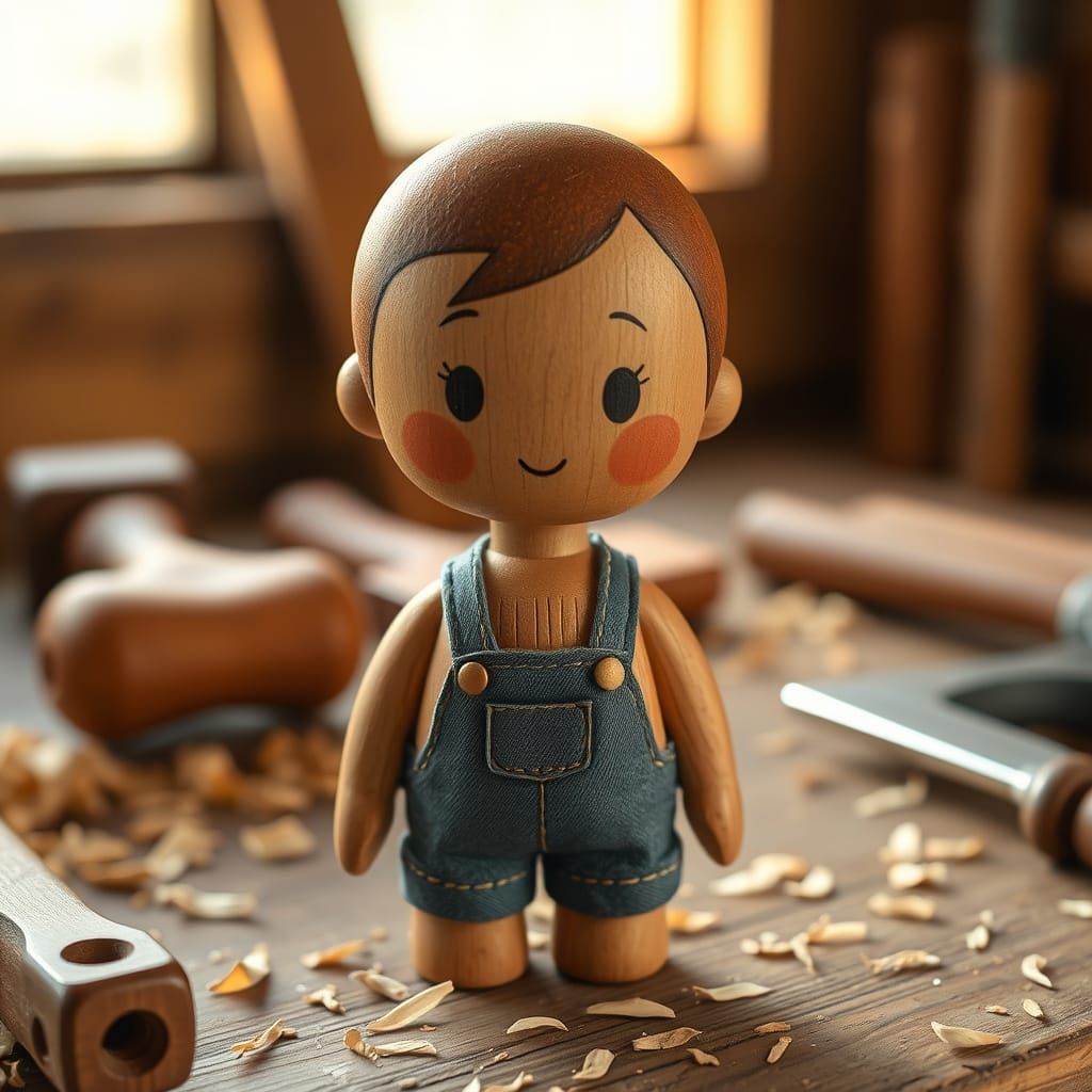 This image shows a charming, rustic hand-carved wooden doll. The doll is articulated and features an expressive face. Set on a workbench with vintage tools, the image evokes a nostalgic atmosphere with warm, earthy tones.