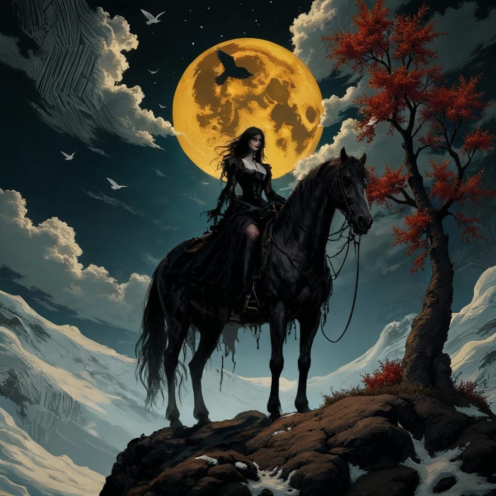 A gothic woman rides a horse through dark, shadowy patterns. The dramatic perspective and comic horror elements evoke a unique, unsettling atmosphere.