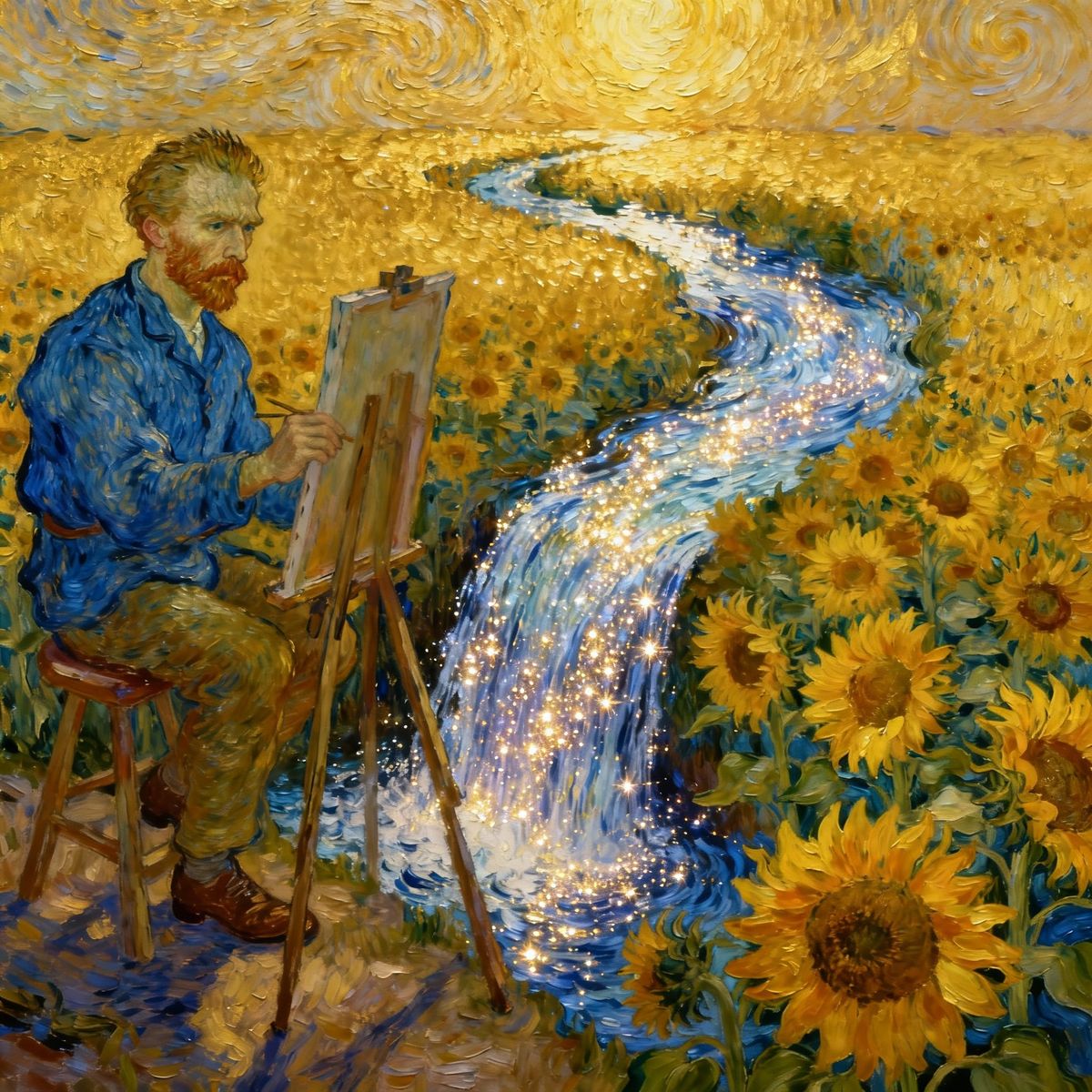 This image shows an artist painting a magical, glittering river that spills into a waterfall feeding a sunflower field. Rendered in an expressive impasto oil style with textured brushstrokes and bold colors.