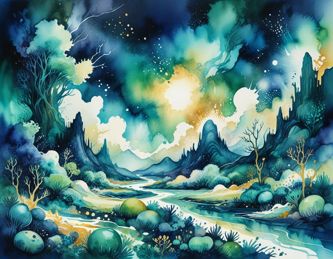 This image shows an otherworldly alien landscape in cool colors with diffuse lighting. The scene is rendered in expressive watercolor techniques with cream and gold hues for an ethereal, maximalist aesthetic.
