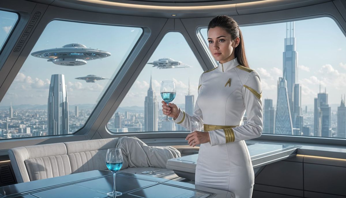 A young Starfleet officer in a white uniform enjoys a drink aboard a luxurious futuristic vessel. Outside, a vibrant city with flying vehicles unfolds under daylight. Photorealistic cinematic style.
