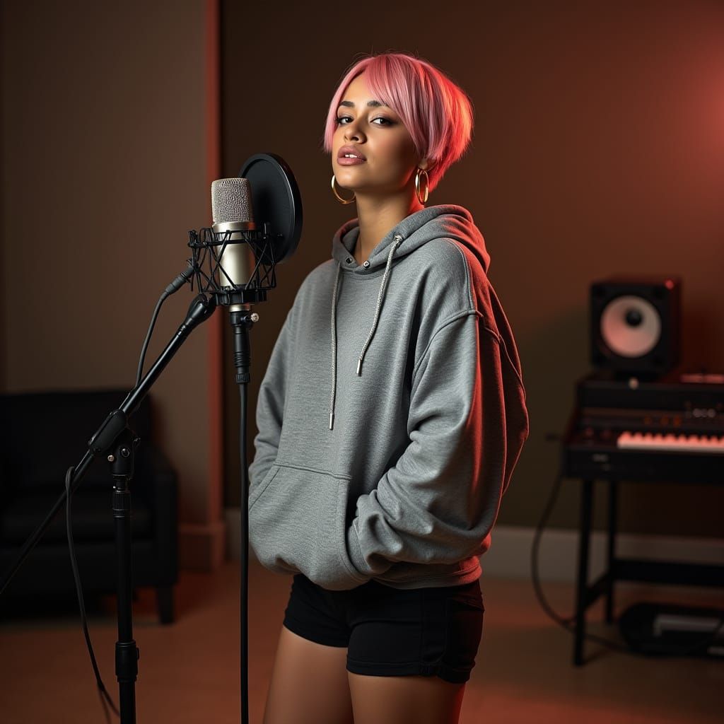A striking picture of a Moroccan female artist singing in a recording studio. The young woman wears a gray hoodie, biker shorts, and sneakers, and features pink hair and gold earrings. The image has a shallow depth of field.