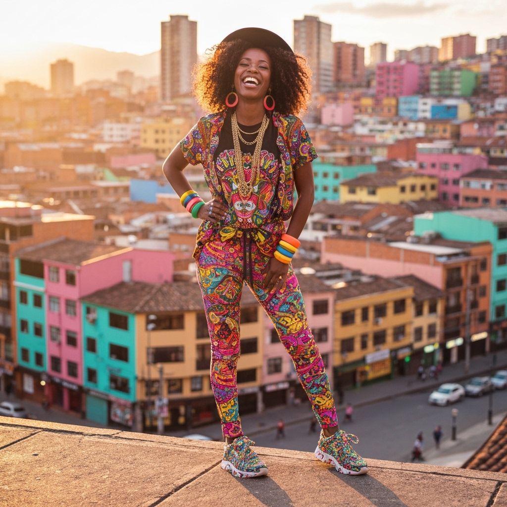 This image shows a smiling Afro-Colombian woman posing in Bogota at sunset. She is wearing vibrant streetwear and gold jewelry. The photo captures the dynamic energy of the city.