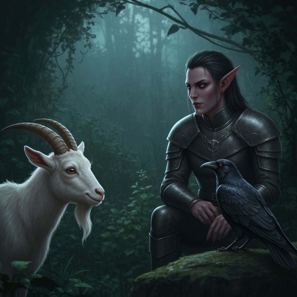 This image shows a dark elf with white hair and black skin in conversation with a goat-like creature in a shadowy, overgrown garden. The image has dark fantasy art elements and hyperrealistic textures.