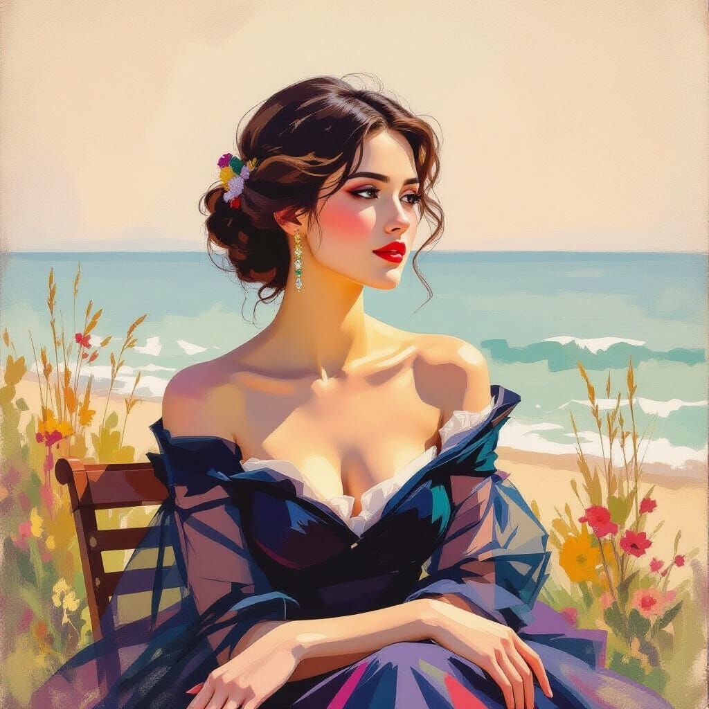 A striking picture of a woman in elegant clothing, lost in thought as she gazes into the distance. This gouache-style artwork features thick brushstrokes, impasto textures, and layered watercolors.