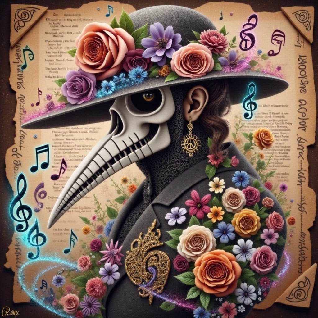 This enchanting watercolor image features a steampunk plague doctor amidst dark roses and vibrant flowers, set against a backdrop of tattered vintage paper with ancient writings and intricate detailing.