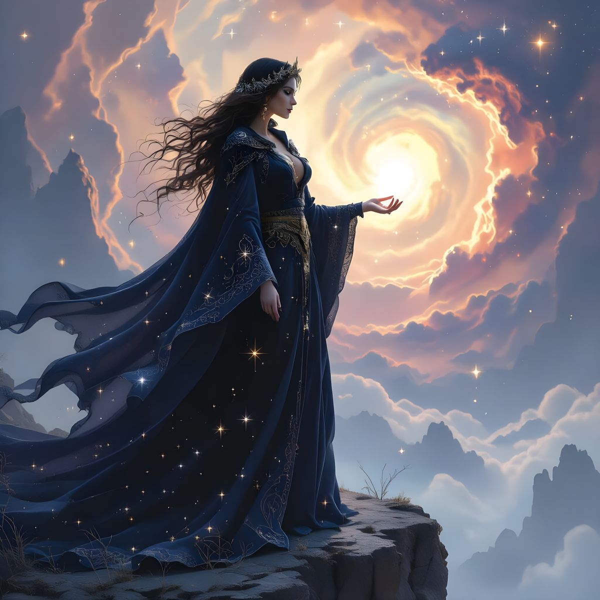 A captivating sorceress in dark velvet robes stands on a precipice, gazing at a swirling nebula. This gothic art piece, rendered with volumetric lighting, captures a dark fantasy aesthetic.