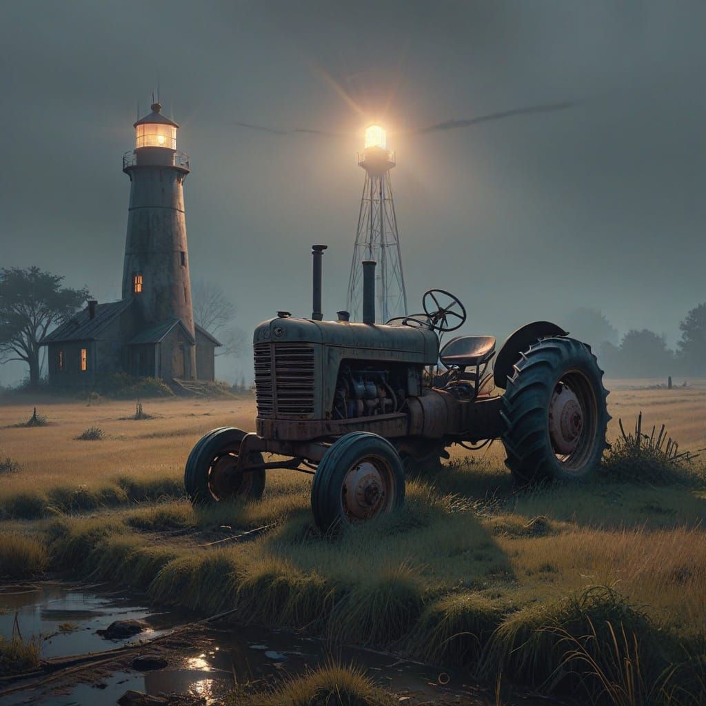 A lone, vintage tractor sits abandoned in a misty, overgrown field at dusk. The scene is imbued with a sense of forgotten history and quiet melancholy. In the background, a faint, ghostly lighthouse beam cuts through the fog. The overall mood is one of deep mystery and nostalgic longing, rendered in ...