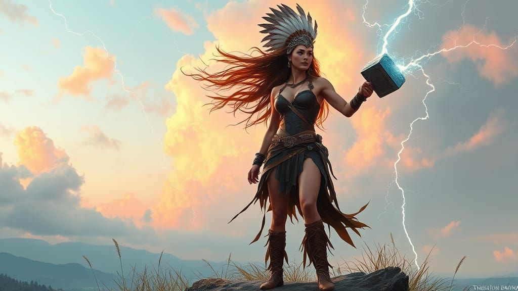A powerful Amazonian warrior stands on a hill, her hair flowing as she summons lightning with Thor's hammer beneath a soft pastel sky. Features a feathered headdress and tattered leather attire.