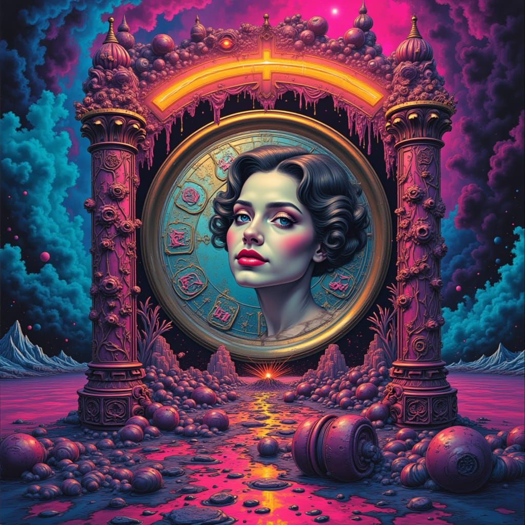 <lora:Different Style:0.6> Surrealism. Wide shot. A melting grandfather clock with a pin-up girl's face emerges from a vibrant, geometric arcade machine. The background is a swirling void of neon colors and distorted game sprites. Digital painting style, inspired by Salvador Dali and early video game ...