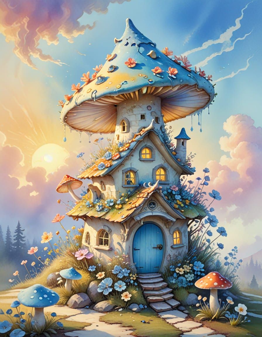 This image showcases a dragonet sleeping by a toadstool home during a misty sunrise. It features delicate watercolor washes and soft, blended colors in pastel tones.