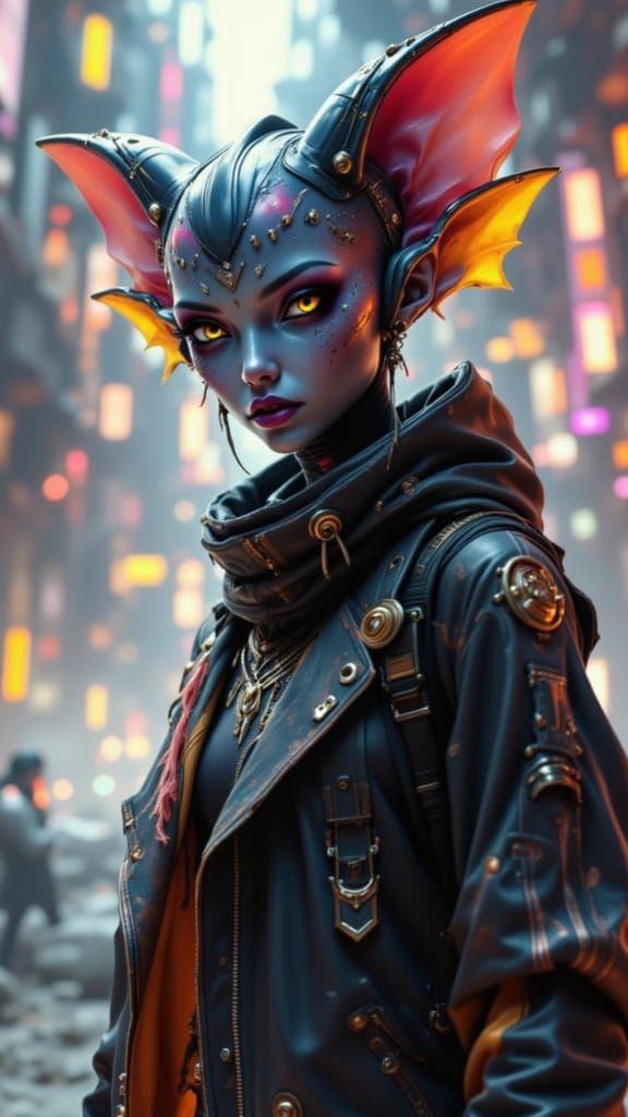 This image shows an alien teenager in fashionable streetwear. The portrait features dynamic lighting and intricate details, with a color palette and rendering style reminiscent of digital art trending on Artstation.