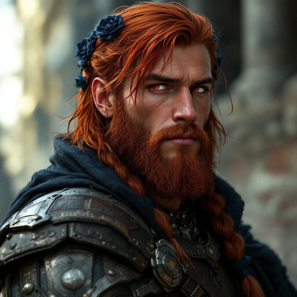 A striking picture of a tall, muscular man with orange and crimson hair, dark red eyes, and a stubbly beard. The image features intricate details and dramatic lighting, reminiscent of digital artwork.