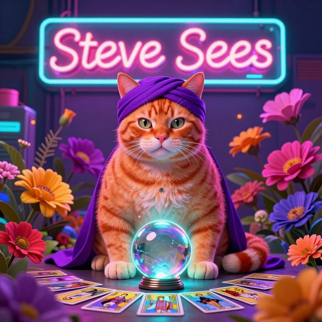 This image shows a muscular orange tabby cat in a purple turban, surrounded by flowers and mystical items. The scene features neon lighting and a vibrant color palette, evoking a retro synthwave aesthetic.
