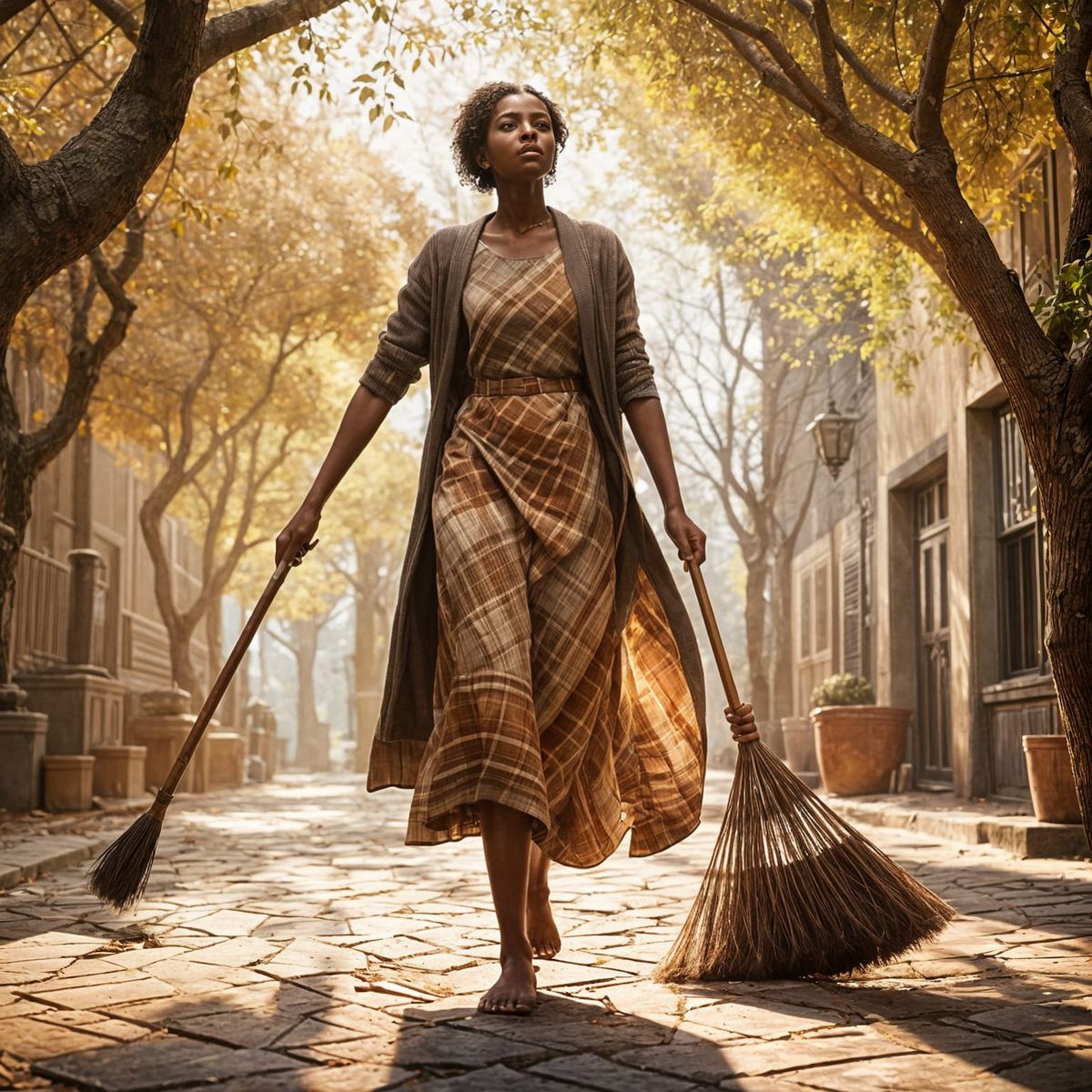 This image depicts a dark brown girl sweeping corridors with tree branches. The scene captures a unique and unexpected use of natural elements in an interior space.