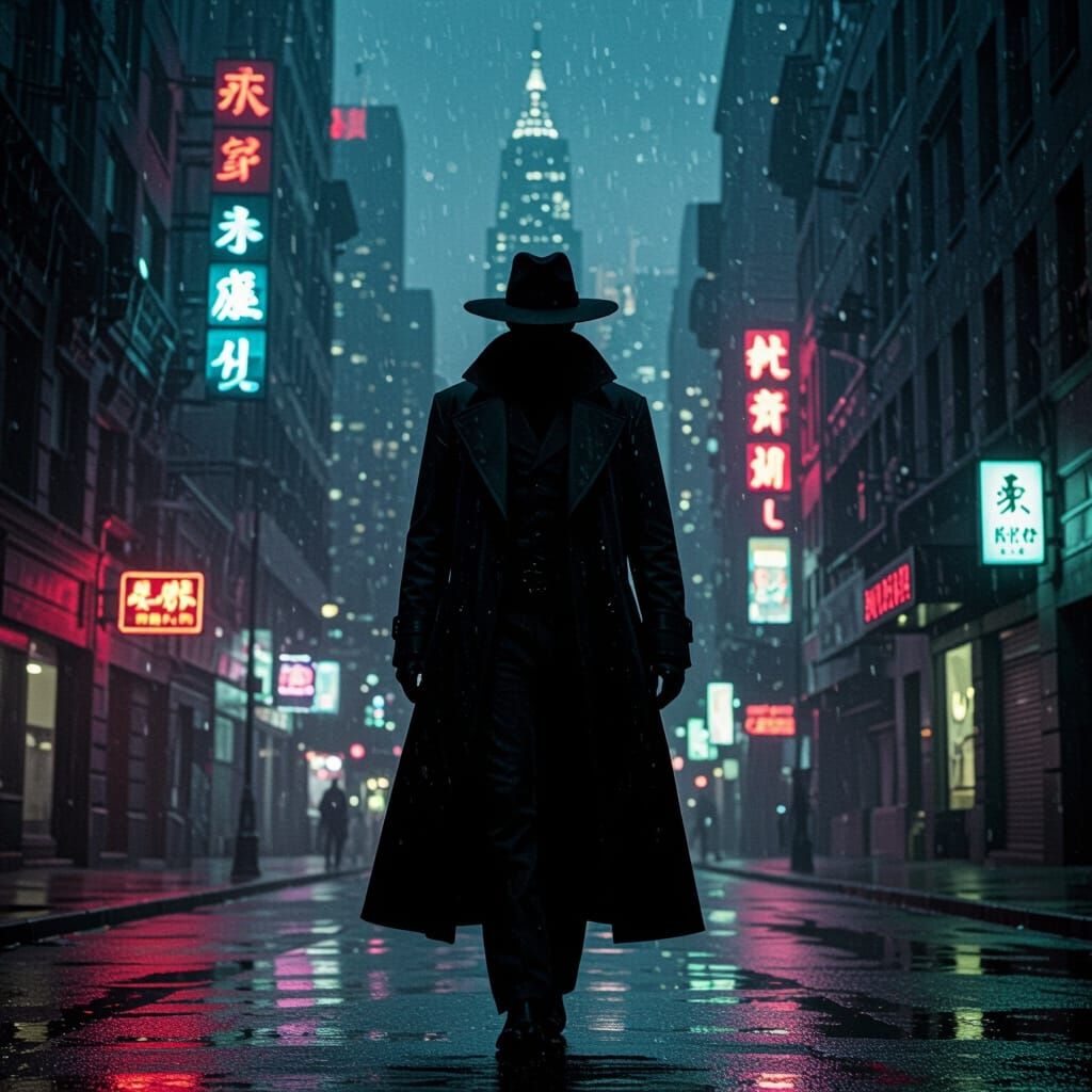 This image shows a shadowy figure in a long coat and hat wandering through a neon-lit, maze-like city of skyscrapers. It evokes a cinematic, film noir aesthetic.