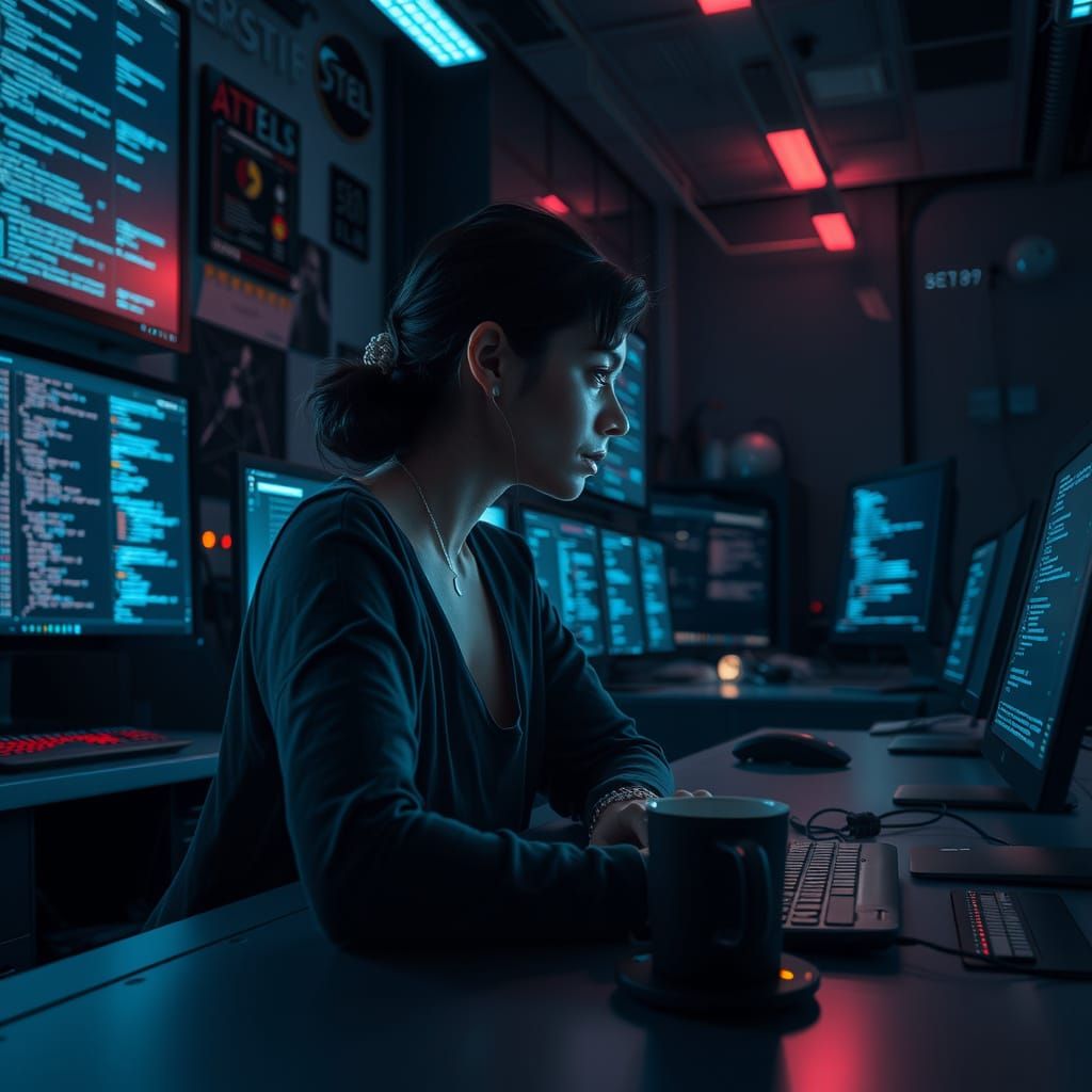 This image shows a woman in a high-tech lab surrounded by screens displaying intricate code, sipping black coffee as the night fades into darkness, in a cyberpunk aesthetic