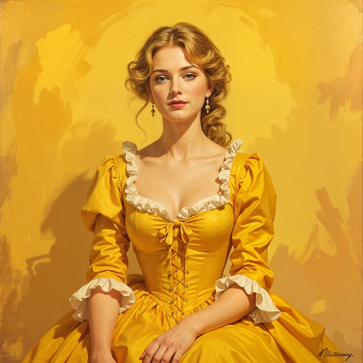 This image is an oil painting from the 1700s, depicting a woman predominantly in shades of yellow, with visible brushstrokes and texture.