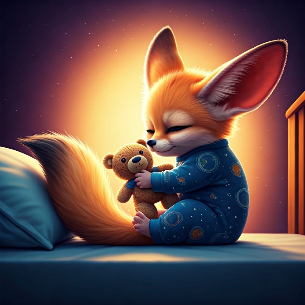 This image shows a cartoon baby fennec fox snuggled on a bed with a teddy bear. Rendered as 3D digital art, the scene features a bright, radial gradient background in a cinematic style.