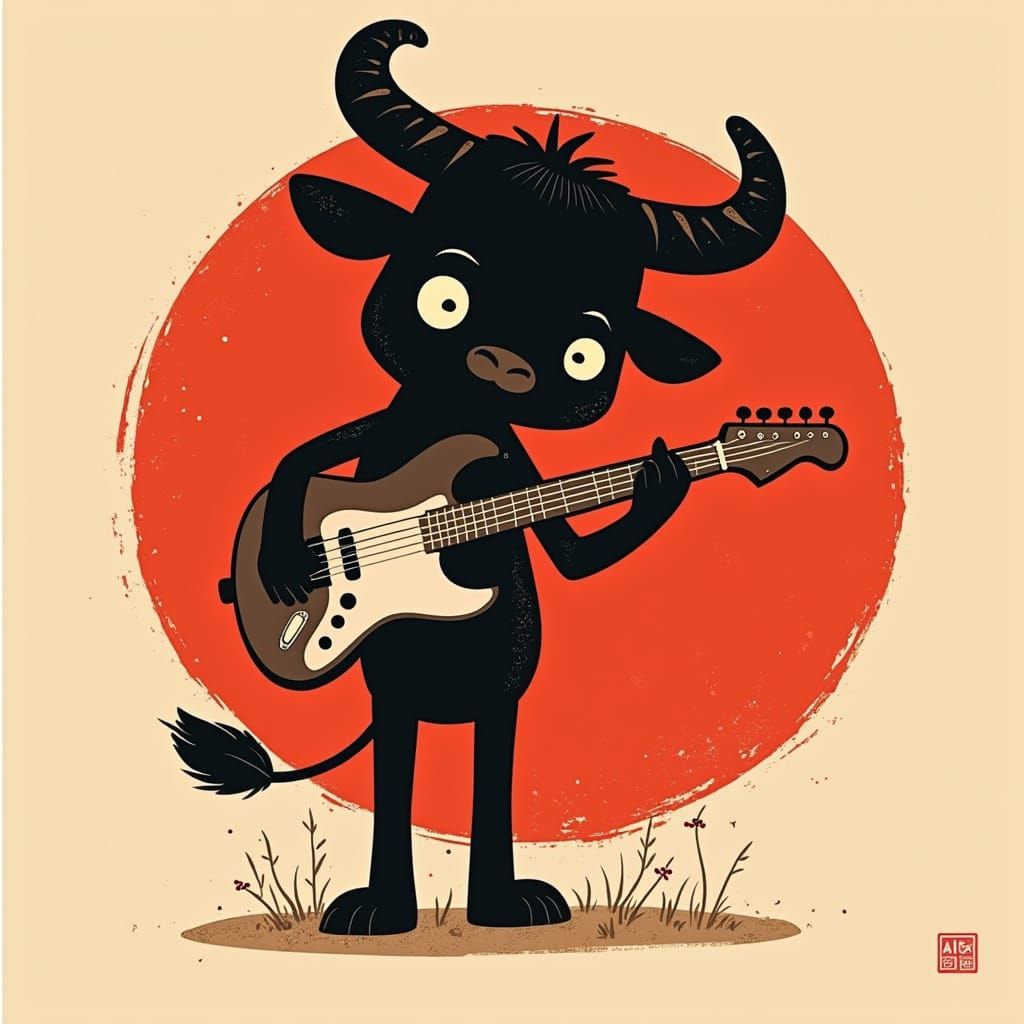 A minimalist ink-style drawing of a black cow holding a red guitar. The artwork is hand-drawn on a white background with stylized brushstrokes in a minimalist aesthetic.