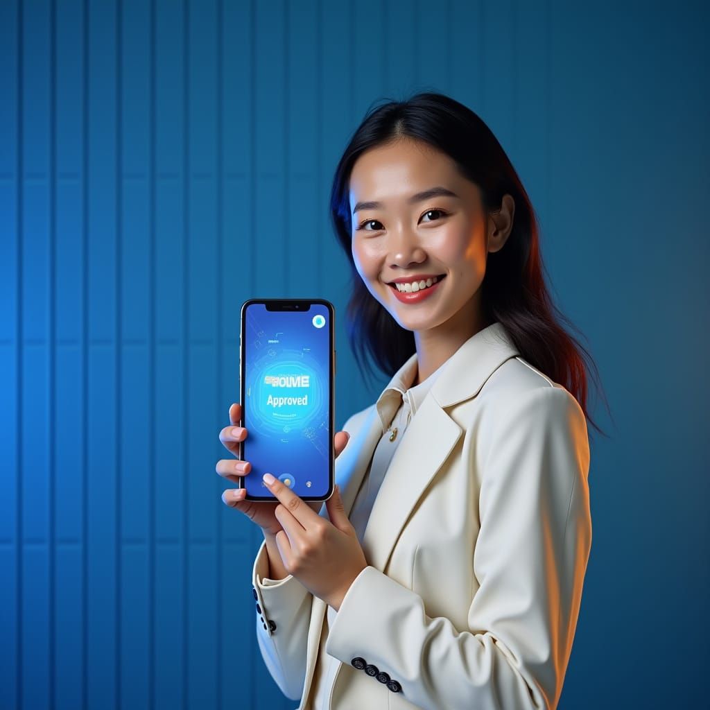 This image showcases a successful Asian businesswoman with a warm smile, holding a smartphone displaying an 'Approved' loan notification, set against a modern blue and gold gradient background with a subtle grid pattern, exuding cutting-edge technology and innovation.