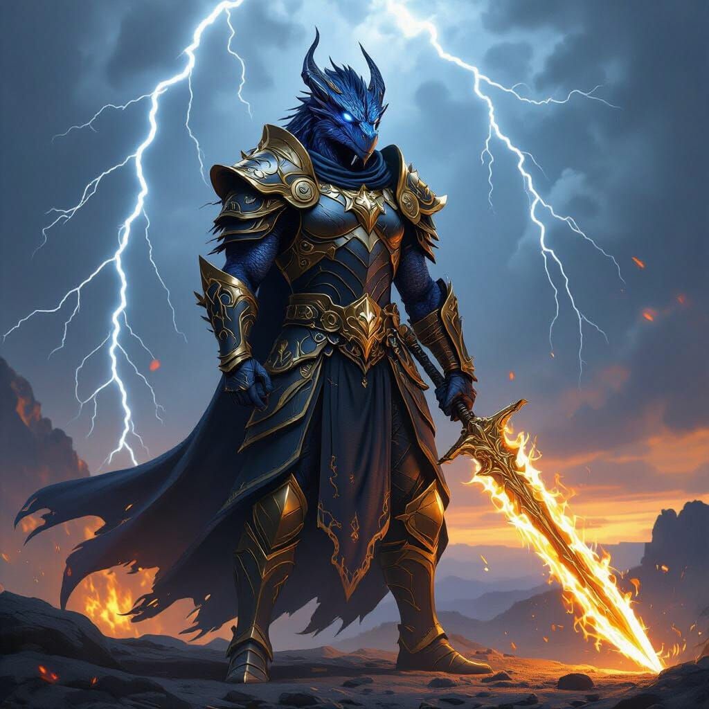 This digital matte painting depicts a 6.6-foot-tall Dragonborn warrior in gold and black armor, wielding a flaming sword amid a dramatic thunderstorm. Inspired by epic fantasy art with dynamic lighting.