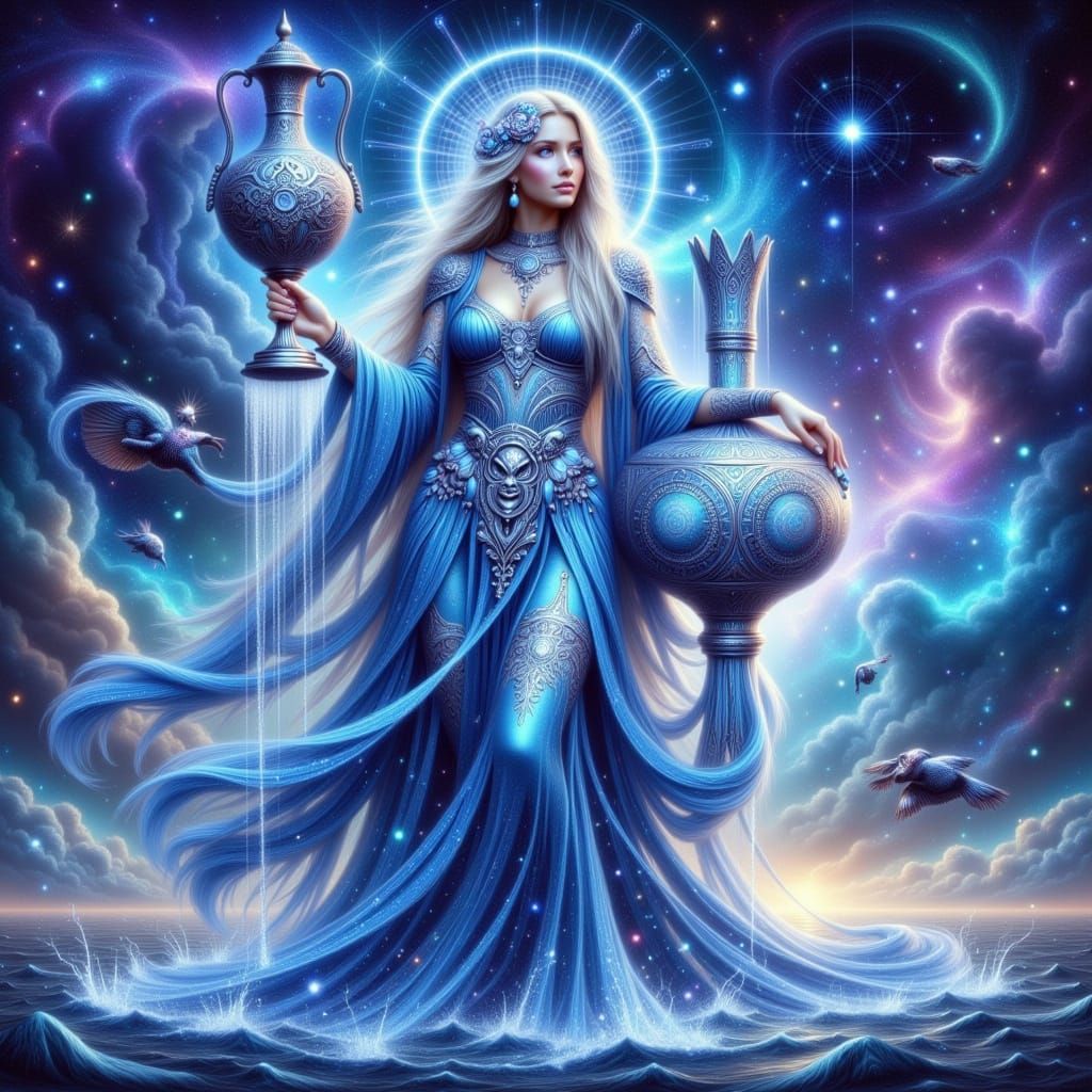 This image depicts a majestic, ethereal figure representing Aquarius, set against a dreamy, starry night sky, pouring water from an ornate, glowing urn, in a mystical, symbolist painting style blending cosmic wonder and elegant realism