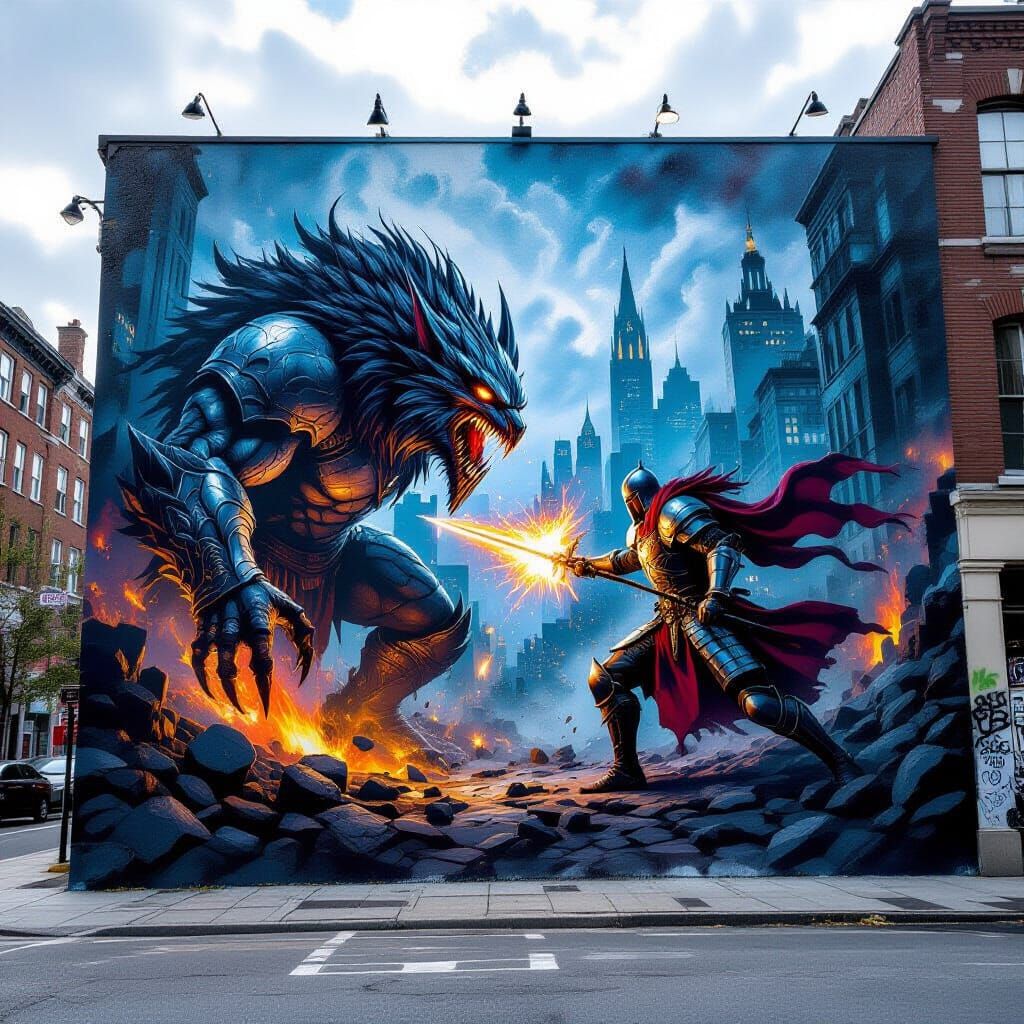 This image shows a mural of a knight battling a mythical creature amidst urban decay. Airbrush art techniques create smooth transitions, dramatic lighting, and vivid colors to accentuate magical effects. A maximalist digital matte painting.