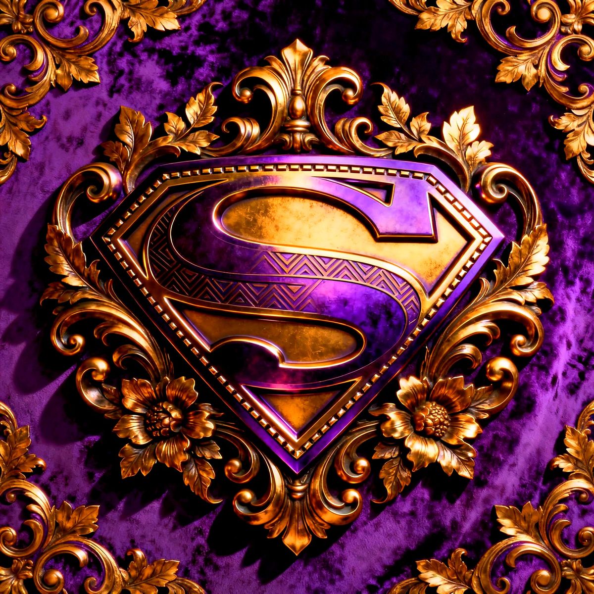 A striking image of the Superman emblem rendered in a rich, violet baroque style. This artwork combines superhero iconography with ornate historical artistic elements.