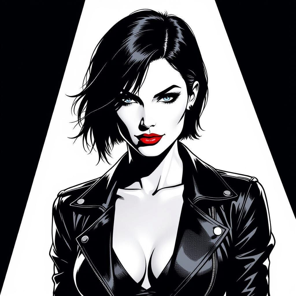 This image captures a striking woman with sharp features and short black hair in a high-contrast, black-and-white graphic novel style. Dramatic shadows and stark noir lighting define her determined expression and leather jacket.