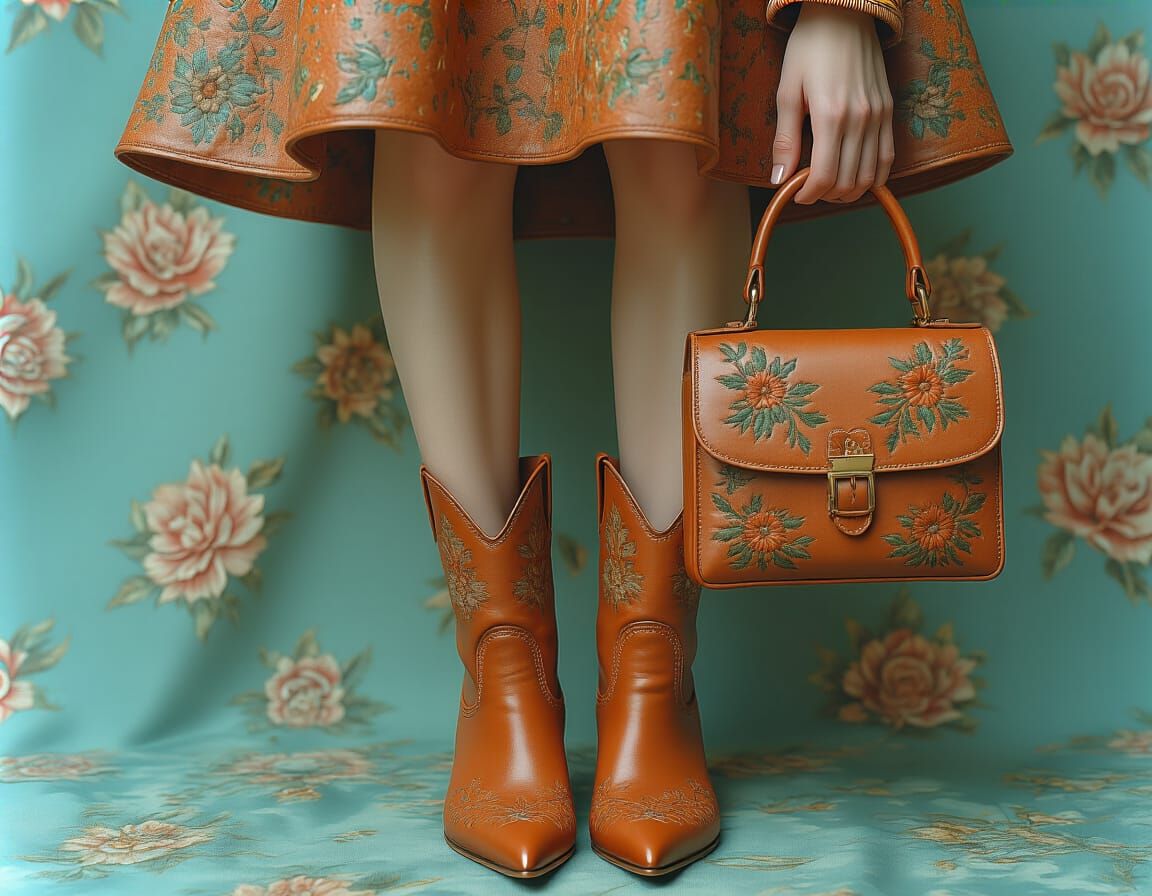 This hyperrealistic oil painting features a woman's lower body in Russia, showcasing brown leather boots and a handbag with embossed floral patterns. The scene sparkles with maximalist detail and volumetric lighting in indigo and turquoise hues.