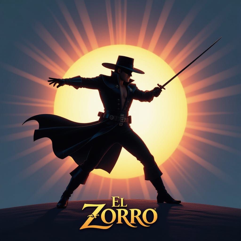 A dynamic movie poster for 'El Zorro' featuring the character silhouetted against a vibrant gradient. Rendered with sharp detail and cinematic lighting in a Pixar-inspired 3D concept art style.