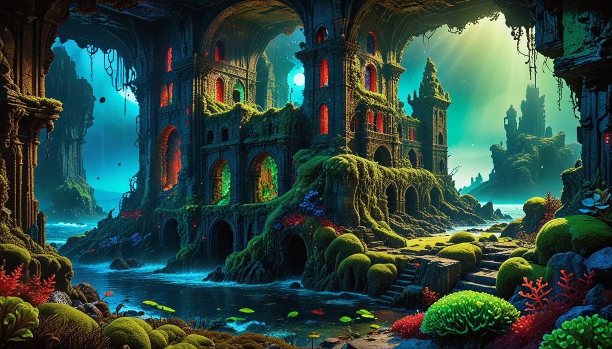 This image shows a detailed underwater scene of an ancient Atlantean city overgrown with vibrant green and red moss and seaweed. The ruins glow with warning lights shifting from blue to green.