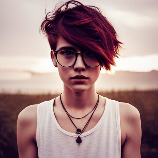 This image shows a soft butch lesbian in a Polaroid-style portrait. The girl has a cute, hipster aesthetic with intricate details, deep colors, and a fantastical concept art style.