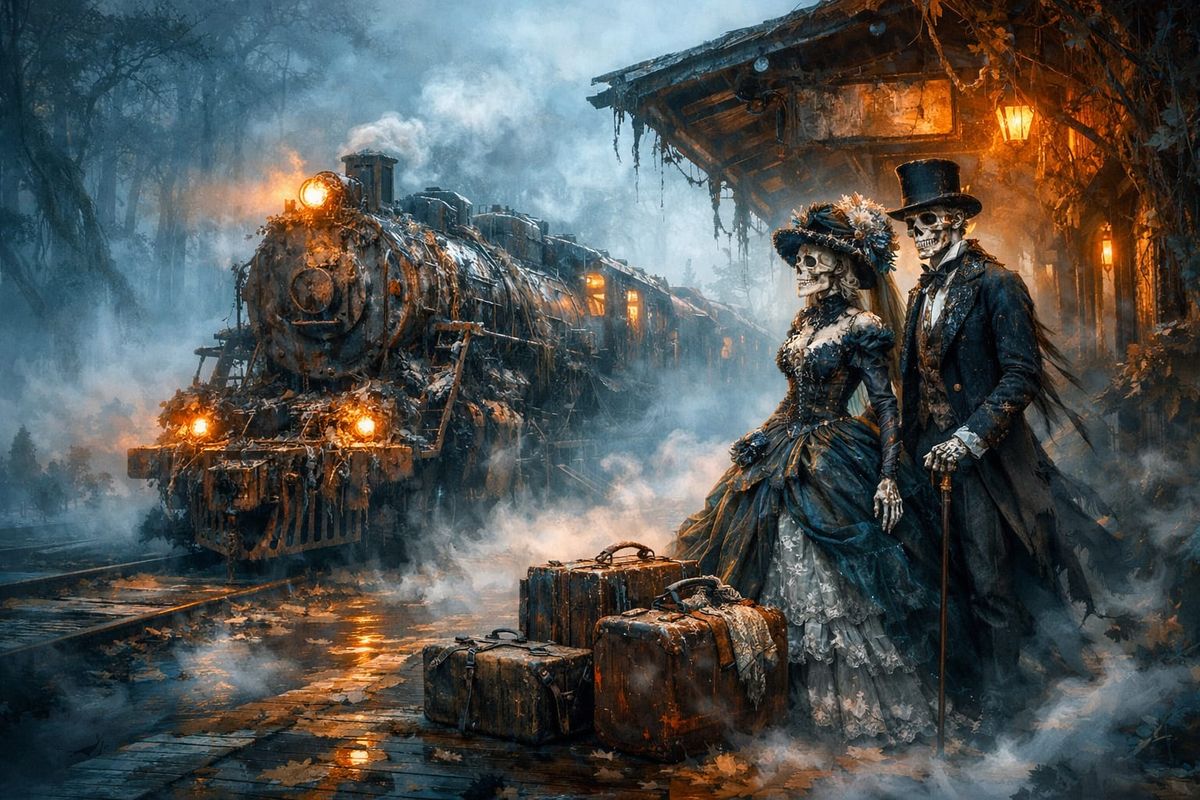 This haunting concept art depicts a spectral train emerging from mist to a decaying station where an elegant skeletal couple in 1800s attire waits with their luggage. Intricately detailed, unreal engine 5 style.