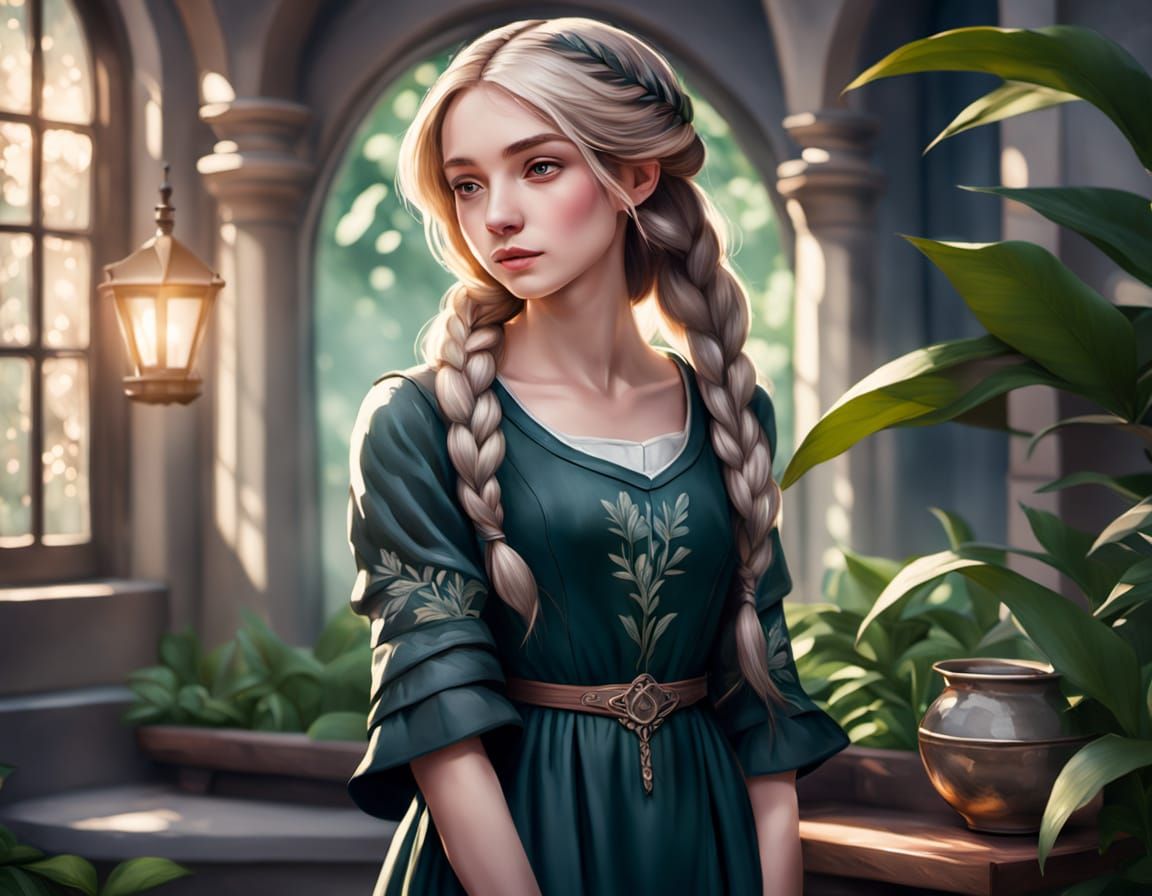 A beautifully composed portrait of a woman in a serene garden setting, featuring soft natural light and intricate details reminiscent of Johannes Vermeer's use of chiaroscuro.